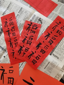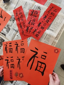 Tout au long de la journée, les élèves de chinois LV2 se sont livrés à diverses activités (réception des fameuses « enveloppes rouges » ou hong bao红包 , vœux du nouvel an, écriture calligraphiée du caractère du bonheur fu 福, rédactions des phrases parallèles- chunlian春联- (vœux écrits sur papier rouges et collés sur les portes), etc.)