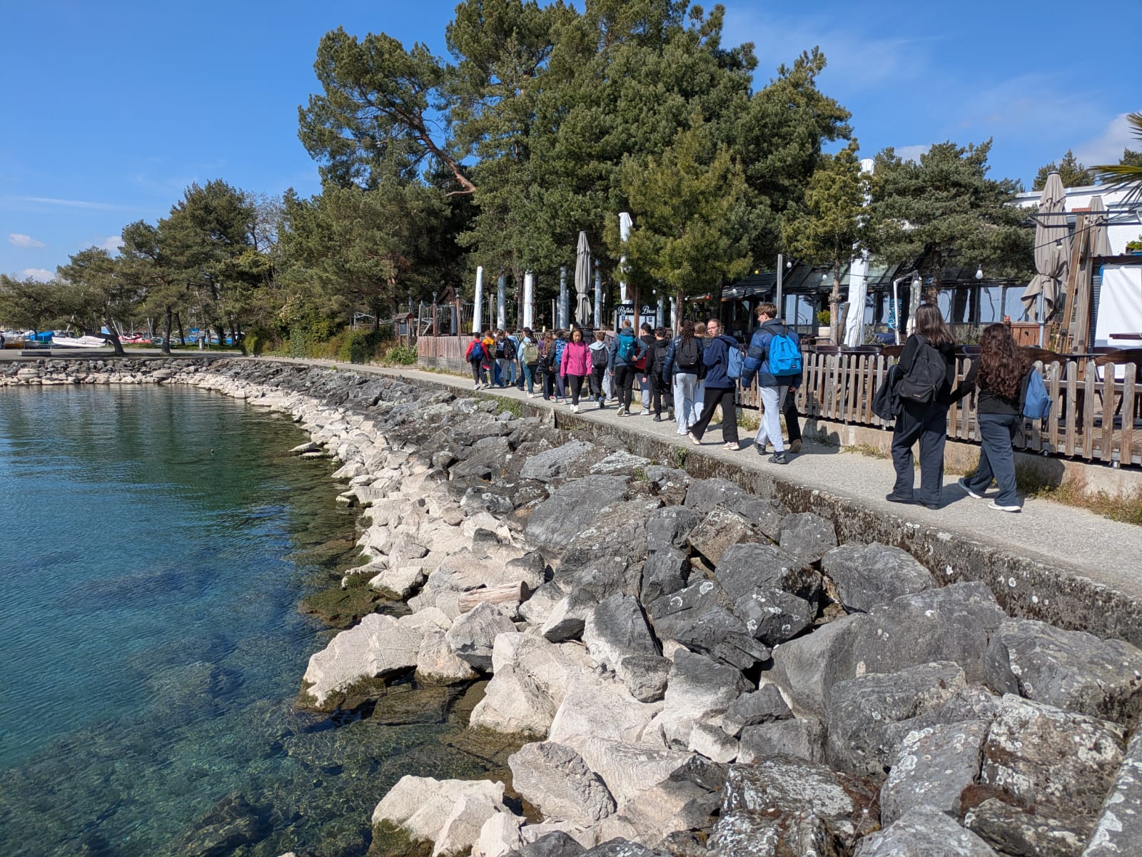 L’après-midi, les élèves ont poursuivi avec une randonnée sur le « Chemin du sport » dans un cadre exceptionnel au bord du lac Léman. Ce parcours leur a permis de relier différents lieux symboliques tout en profitant d’une activité physique en plein air. Quelques échanges de volley-ball, d'ultimate et de foot ont ponctués la balade. La journée s’est conclue par l’arrivée au siège du Comité International Olympique (CIO).